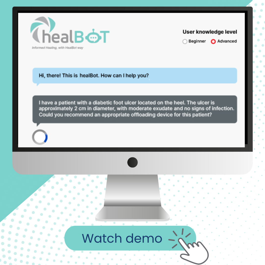 Powered by artificial intelligence and the latest published wound research, healBot provides answers to wound care questions and helps providers enhance patient care. Whether you need a list of wound care products, wound care instructions, or updates on the latest in wound research, healBot is here to assist.
